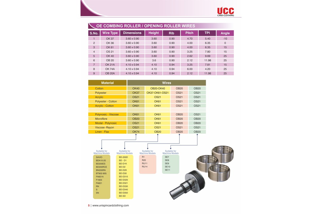 Material Wires Suitable for Machine Models Cotton OK40 Polyester OK37 Acrylic OS21 Polyester - Cotton OK61 Acrylic - Cotton OK61 Polynosic - Viscose OK61 Microfibre OB20 Modal - Polynosic OS21 Viscose -Rayon OS21 Linen - Flax OK74